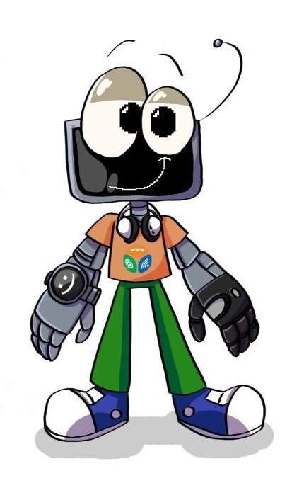Маскот Роботаник ...Это робот-подросток, он любознательный и всегда готов помочь друзьям. Голова робота - монитор, на котором показываются его эмоции; с помощью своих электронных часов он перемещается в цифровом пространстве, а кибер-перчатка позволяет ему управлять цифровыми объектами