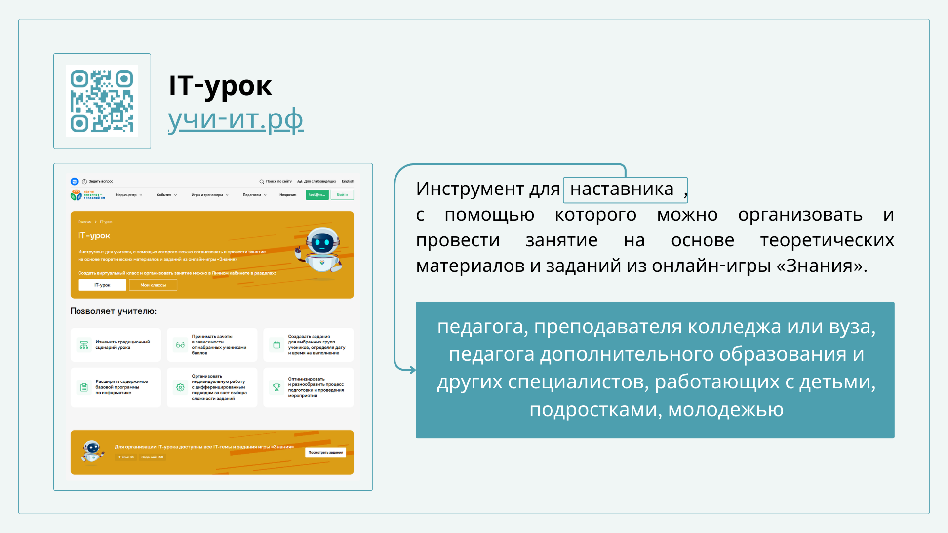 Значительно переработан раздел, рассказывающий о современных цифровых инструментах в образовании – в частности об онлайн- и офлайн-тренажерах нашего проекта, которые легко встраиваются в образовательные мероприятия, делая их интерактивными и увлекательными, а значит и более эффективными.