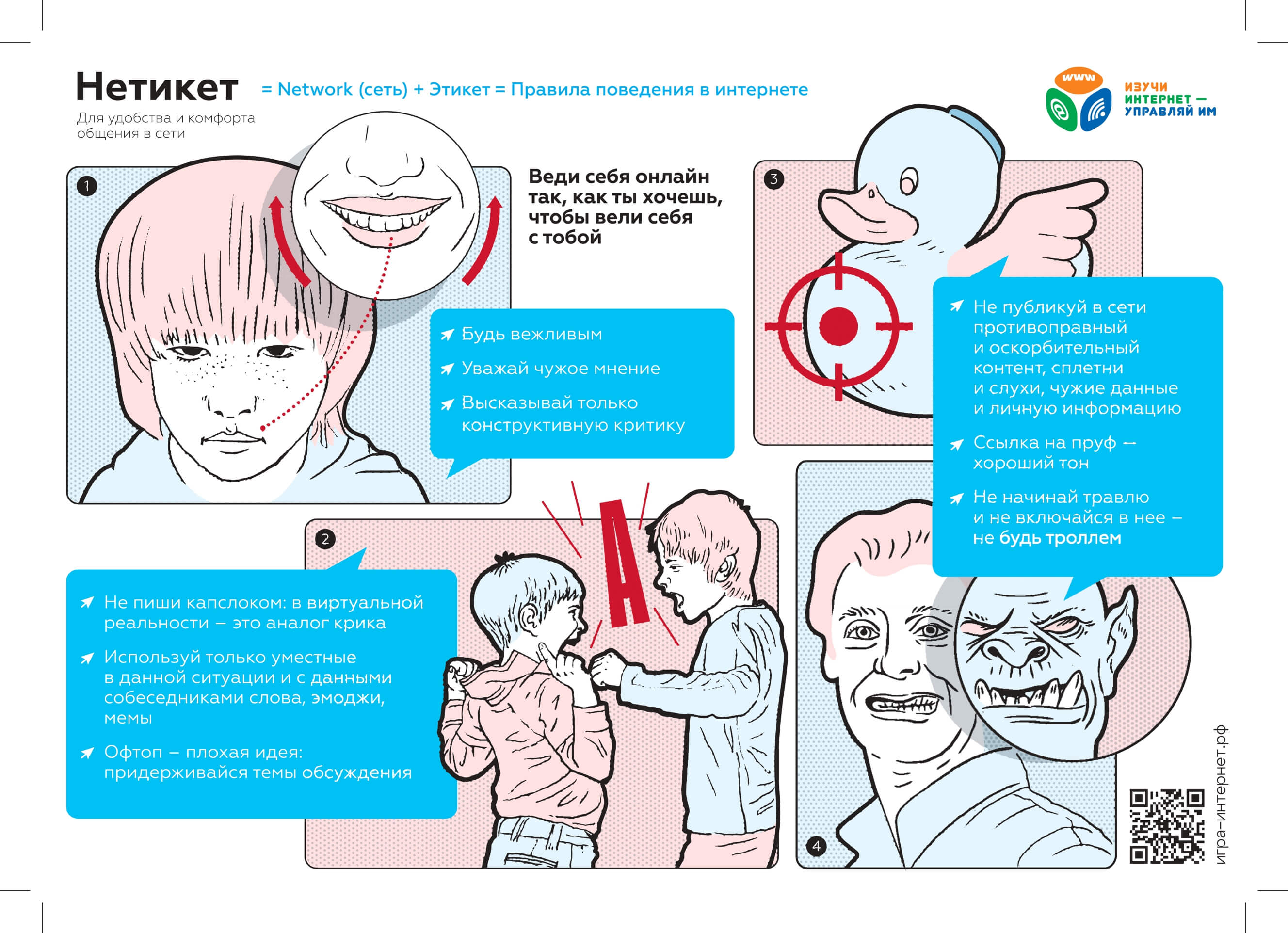 В дополнение к брошюре, к которой, как предполагается, будут чаще обращаться родители, педагоги и специалисты в сфере детского благополучия, разработаны компактные памятки для школьников. Иллюстрации и схемы разъясняют, как сохранить персональные данные в целостности, как могут обидеть в сети, как распознать фейк и какие действия предпринять, если некий пользователь нарушает правила нетикета.