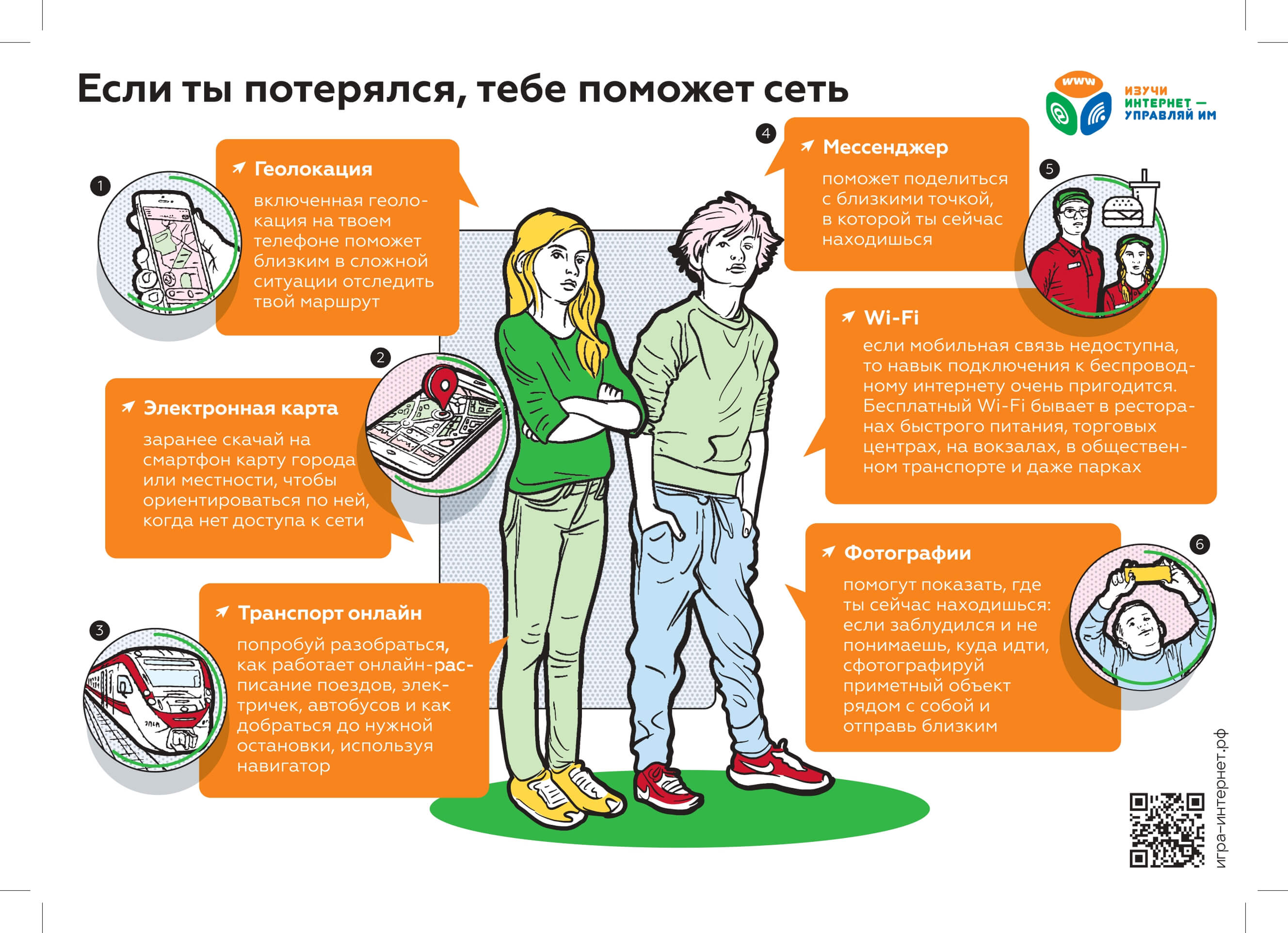 Еще одна памятка обращает внимание детей и родителей на роль интернета как помощника в трудных жизненных ситуациях, в частности, даёт совет, как использовать цифровые инструменты, если ты потерялся.